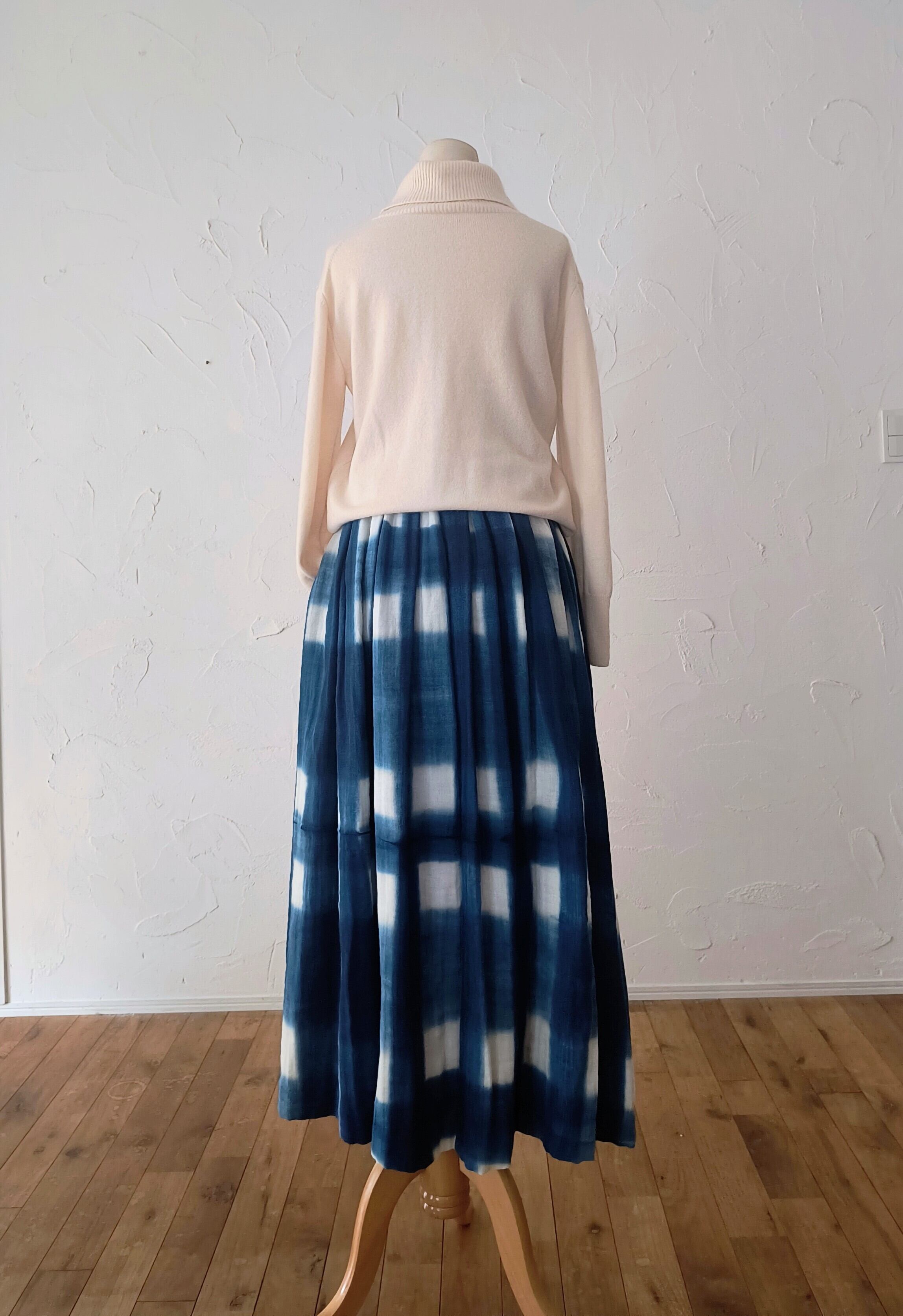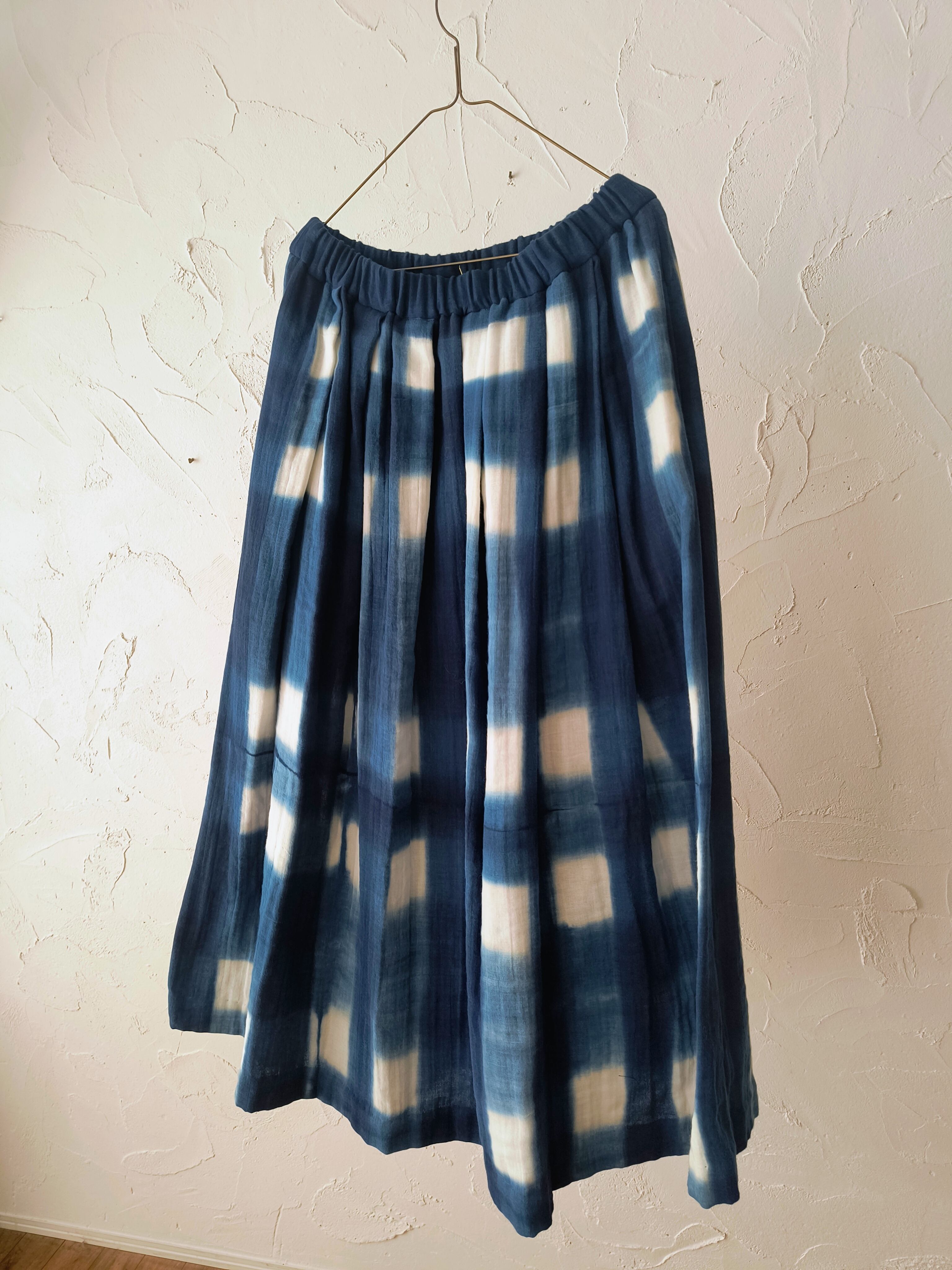 藍染めの板締めによって、ひとつひとつ手作業で仕上げられています。特に白を基調としたチェック柄は、さわやかでありながらもポップな雰囲気を演出します。動くたびに変化するチェック生地が、美しいシルエットを描き、コーディネートにおしゃれなアクセントを加えてくれるでしょう。